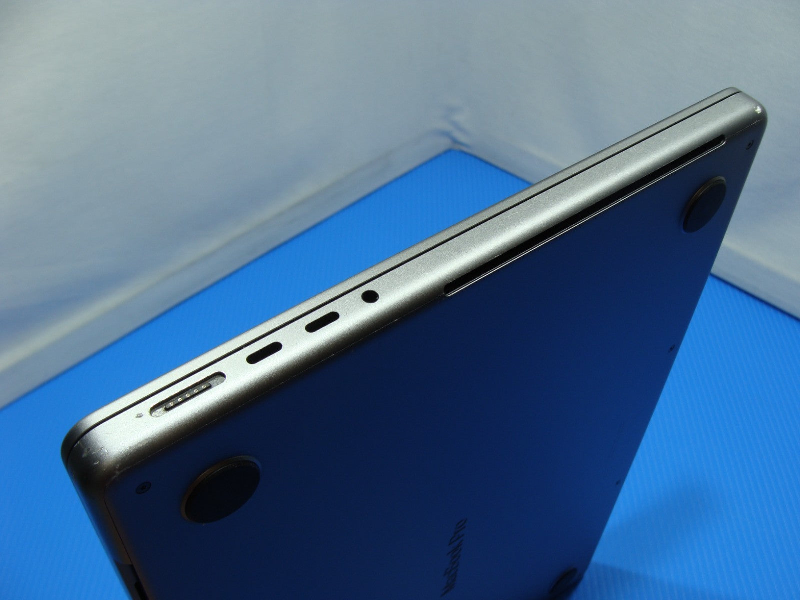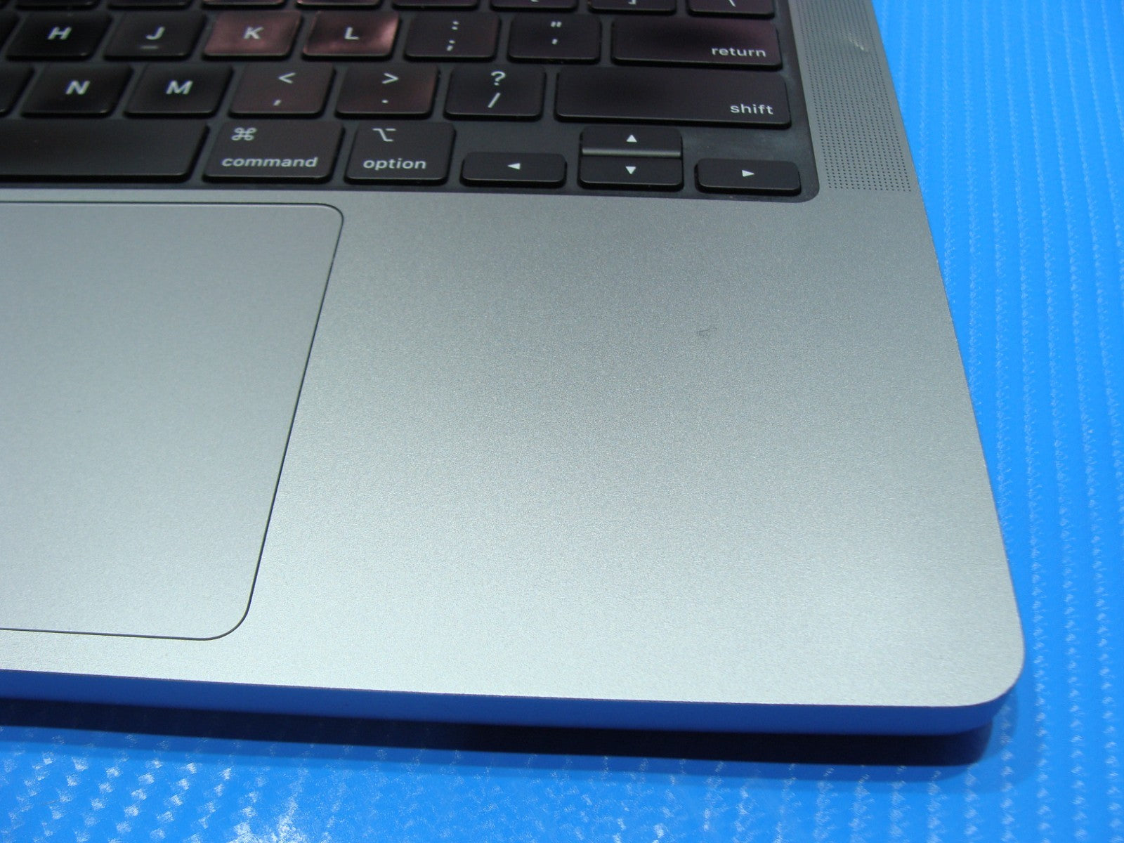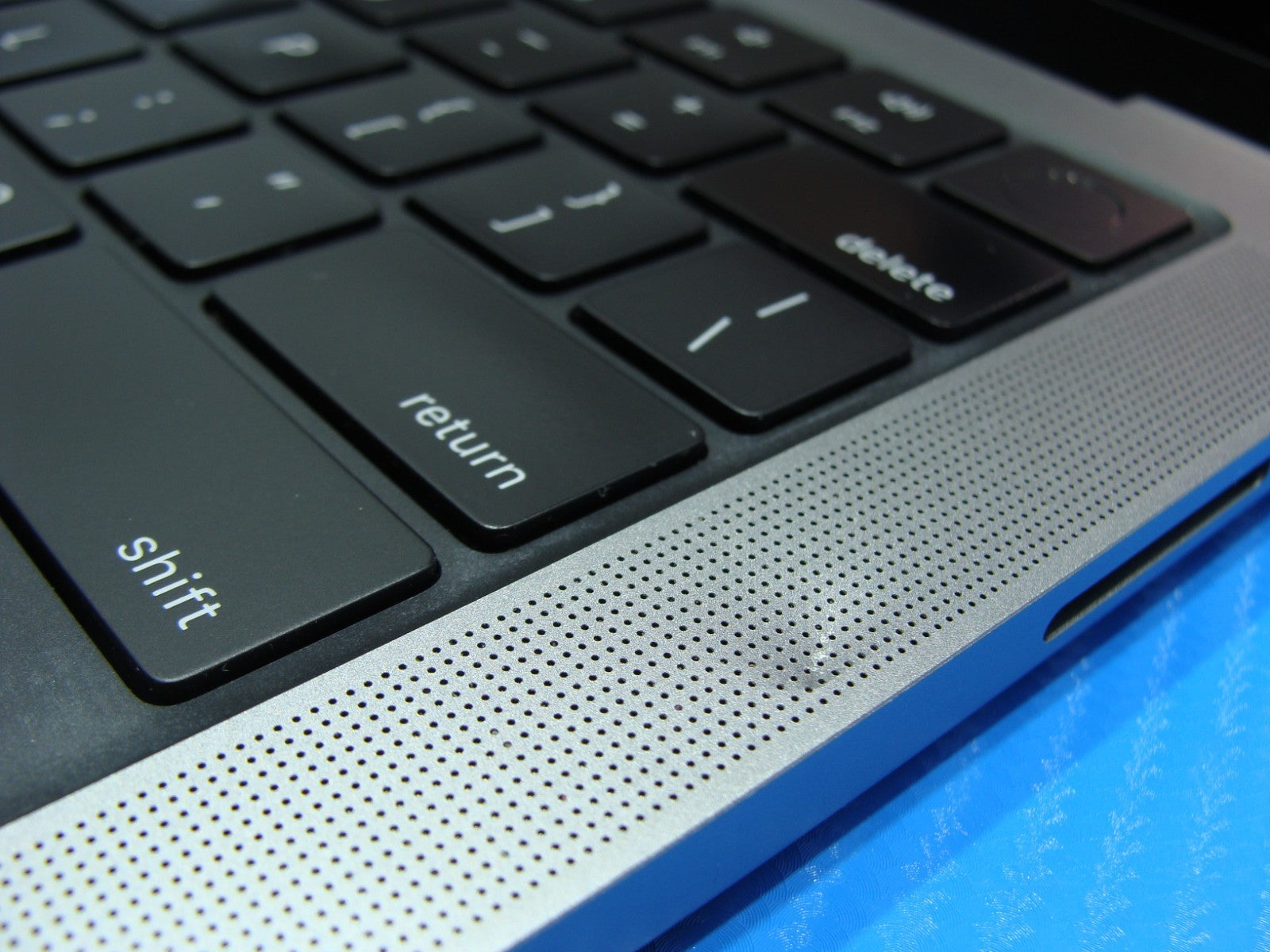 Defect: Cosmetic dent on the aluminum speaker grill near the keyboard.