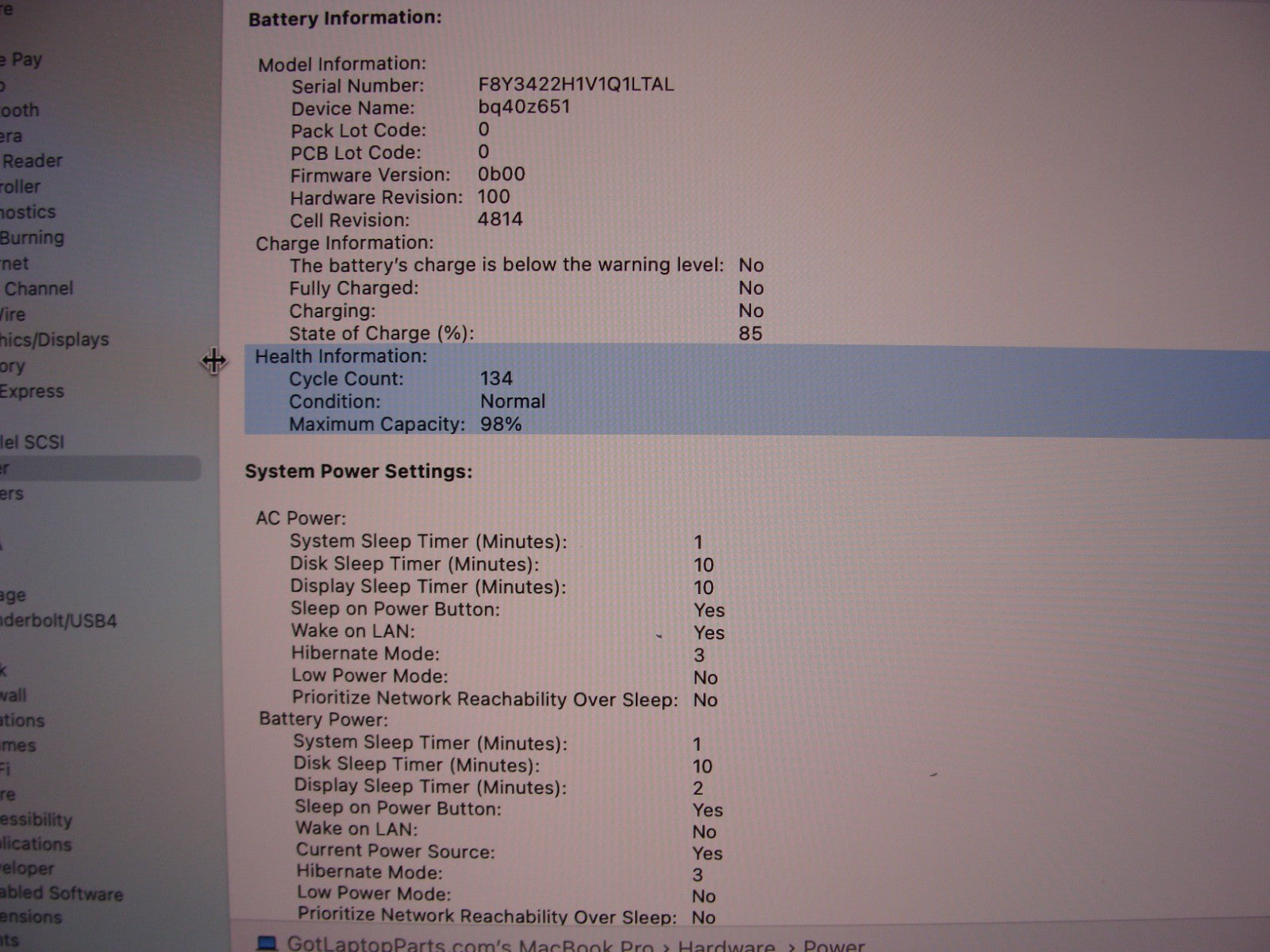 Battery Health: 98% excellent with only 134 power cycles