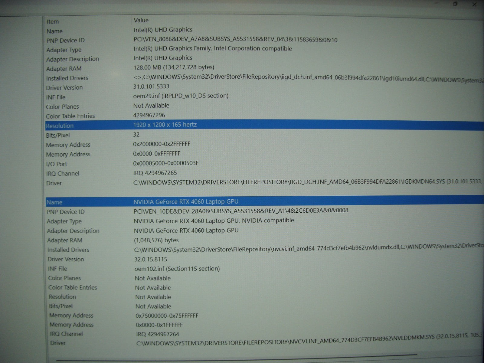 15.6" Resolution: 1920X1200 165hz Screen glass is super clean and LCD is undamaged