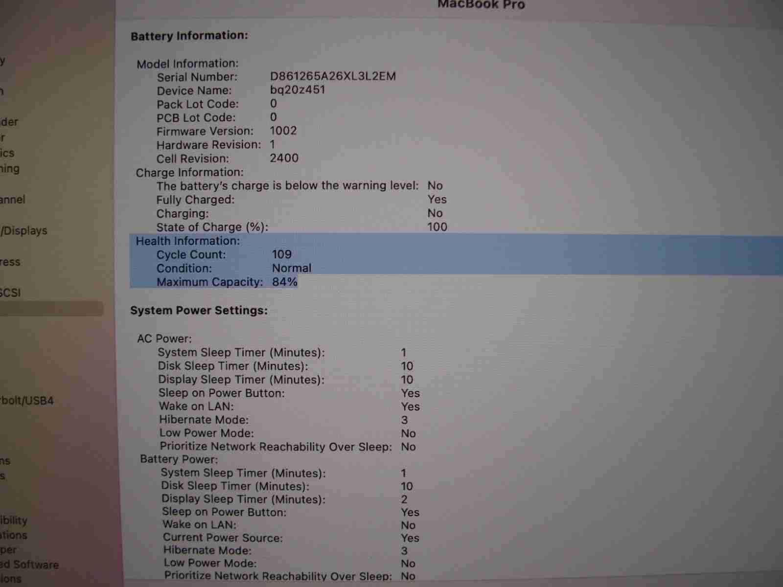 - Battery is shows only 109 power cycles 84%.
