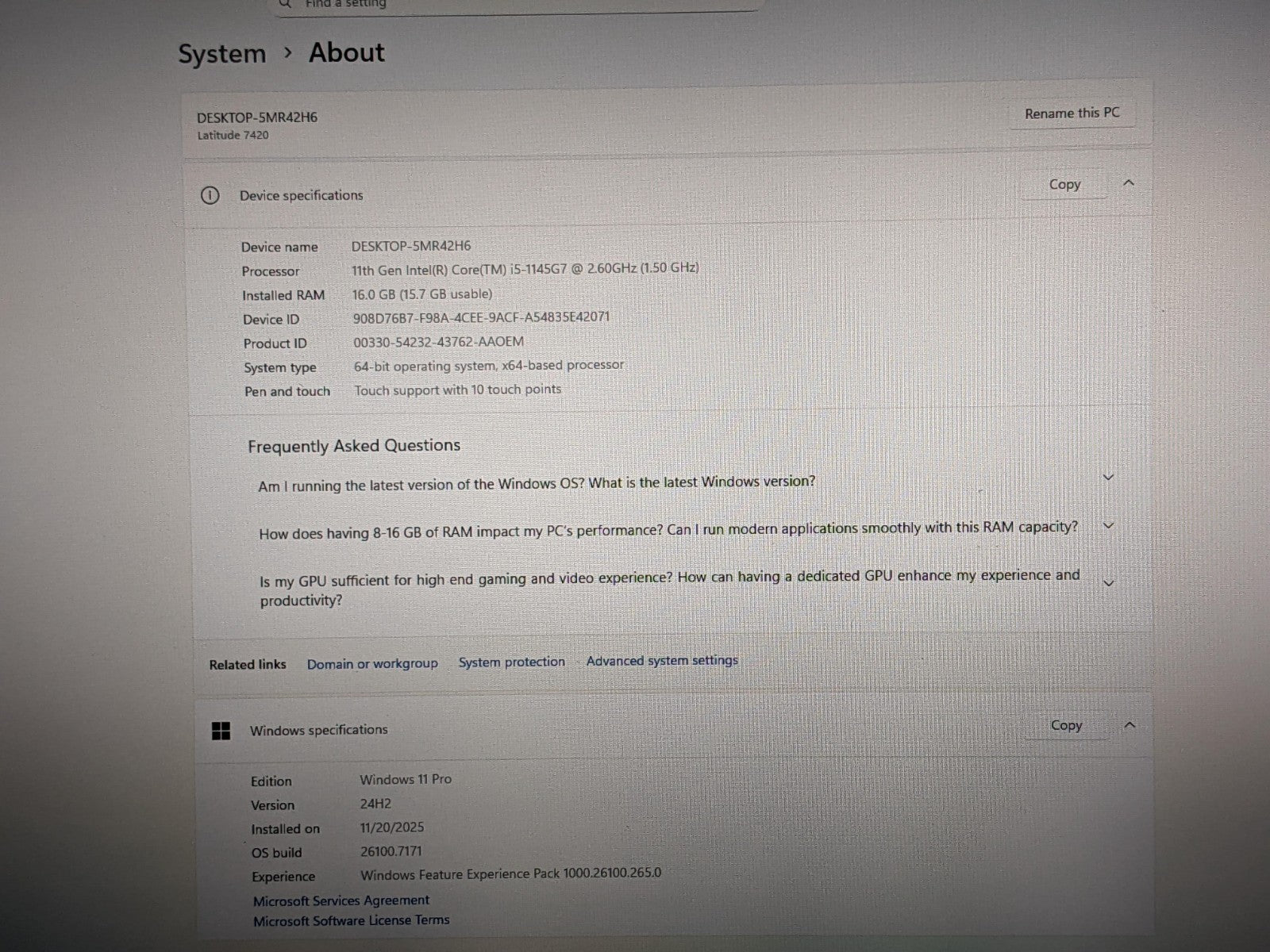 - Dell Latitude 7420 14"FHD TOUCH Core vPRO i5-11th 2.6GHz 16GB 256GB SSD W11P +PA Dell Latitude 7420 14"FHD TOUCH Core vPRO i5-11th 2.6GHz 16GB 256GB SSD W11P +PA