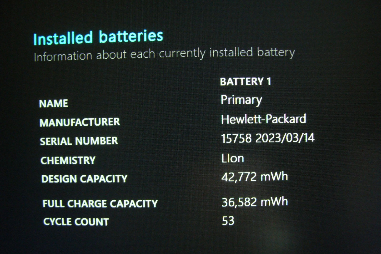 86% 53 cycles Battery in excellent condition according to battery report (image attached).