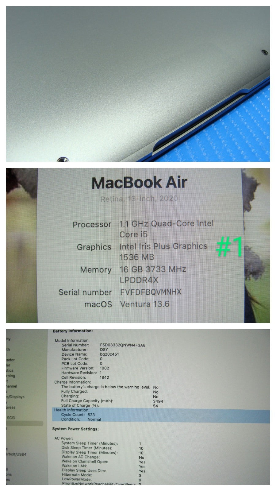 - Battery has 523 power cycles.