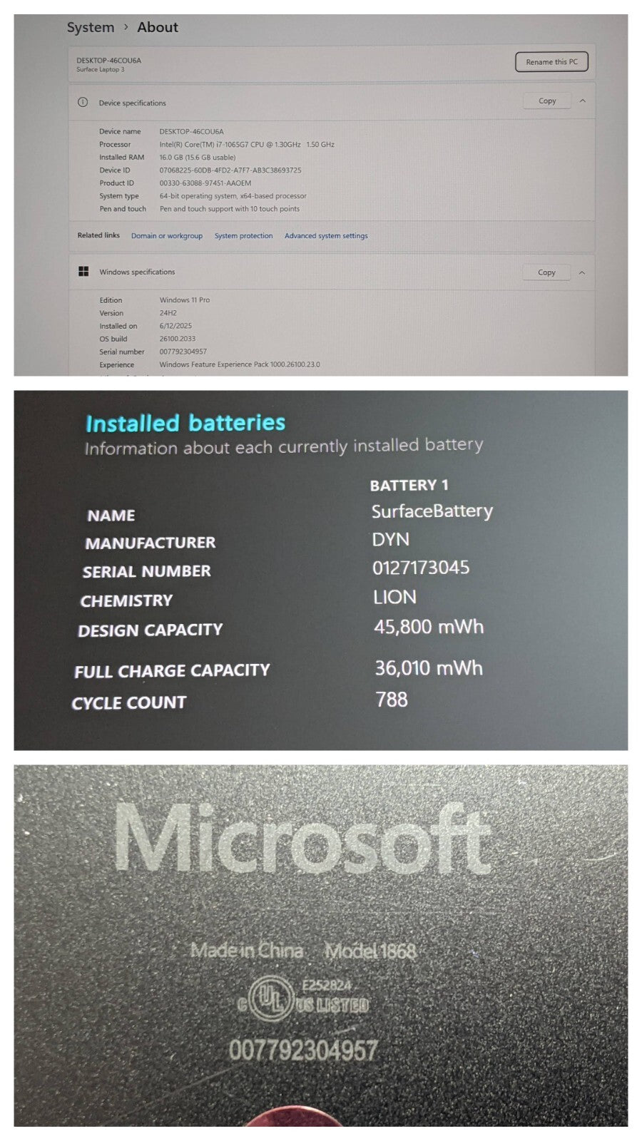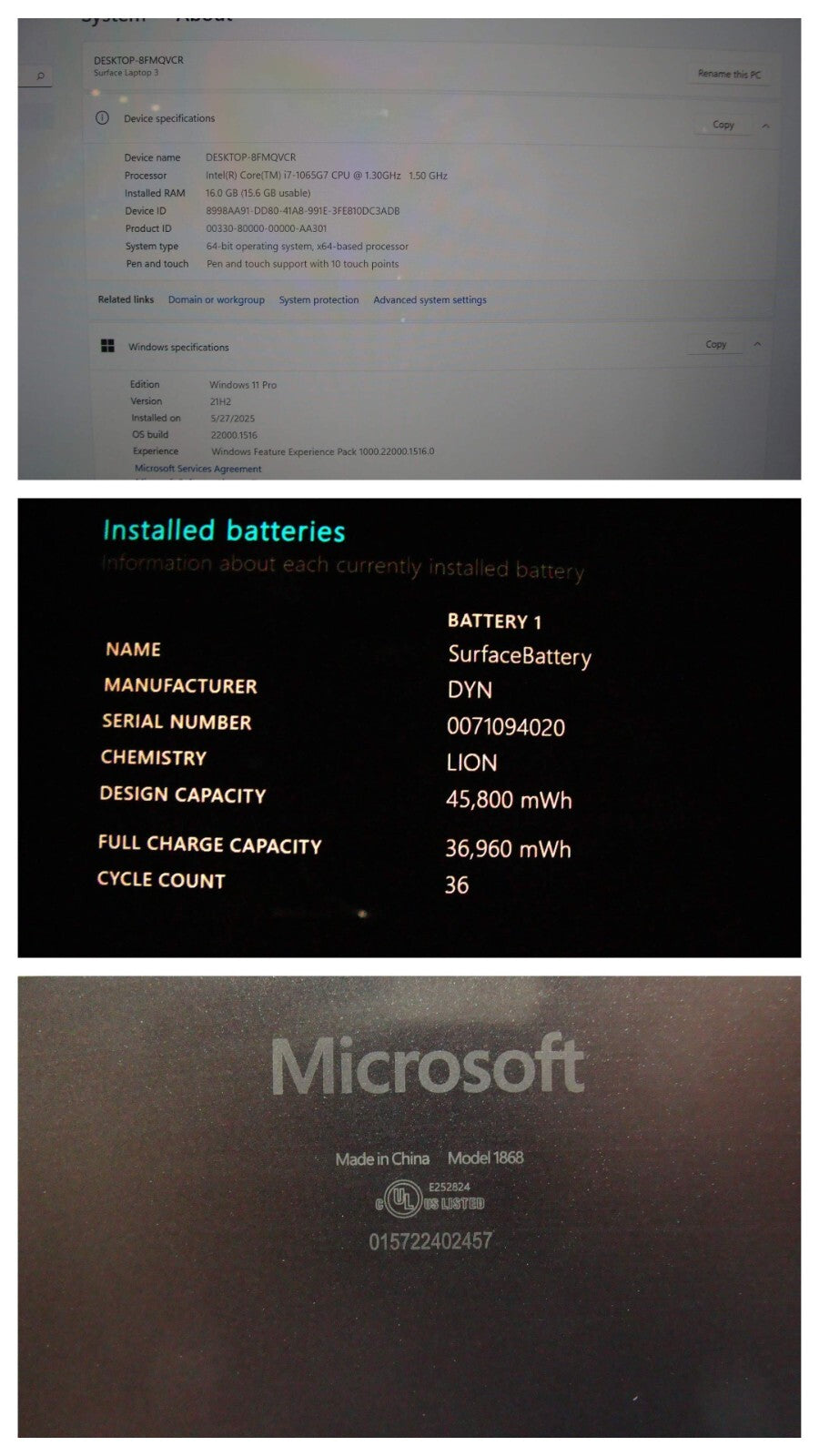Model: Microsoft Surface Laptop 3 1867:1868