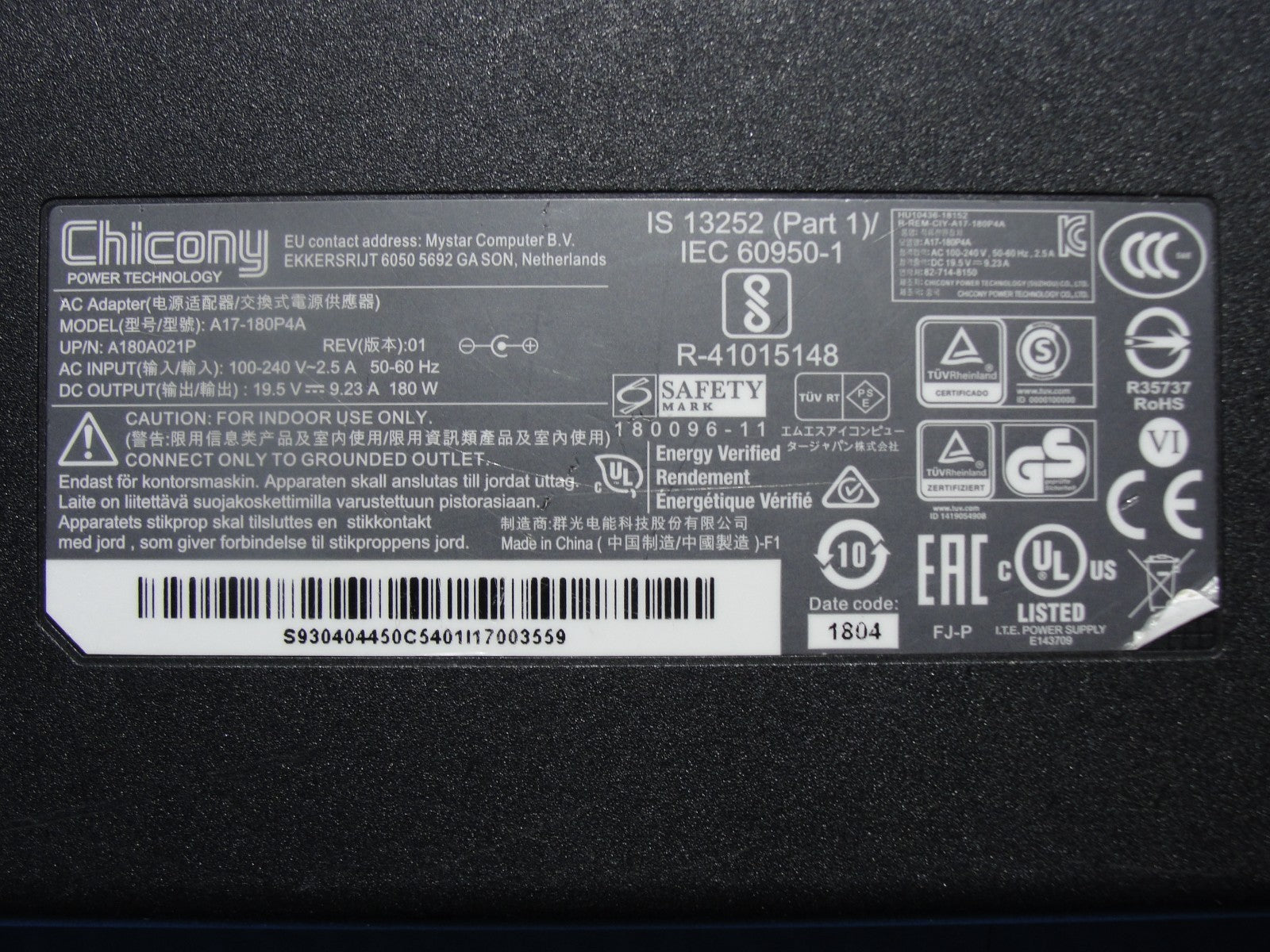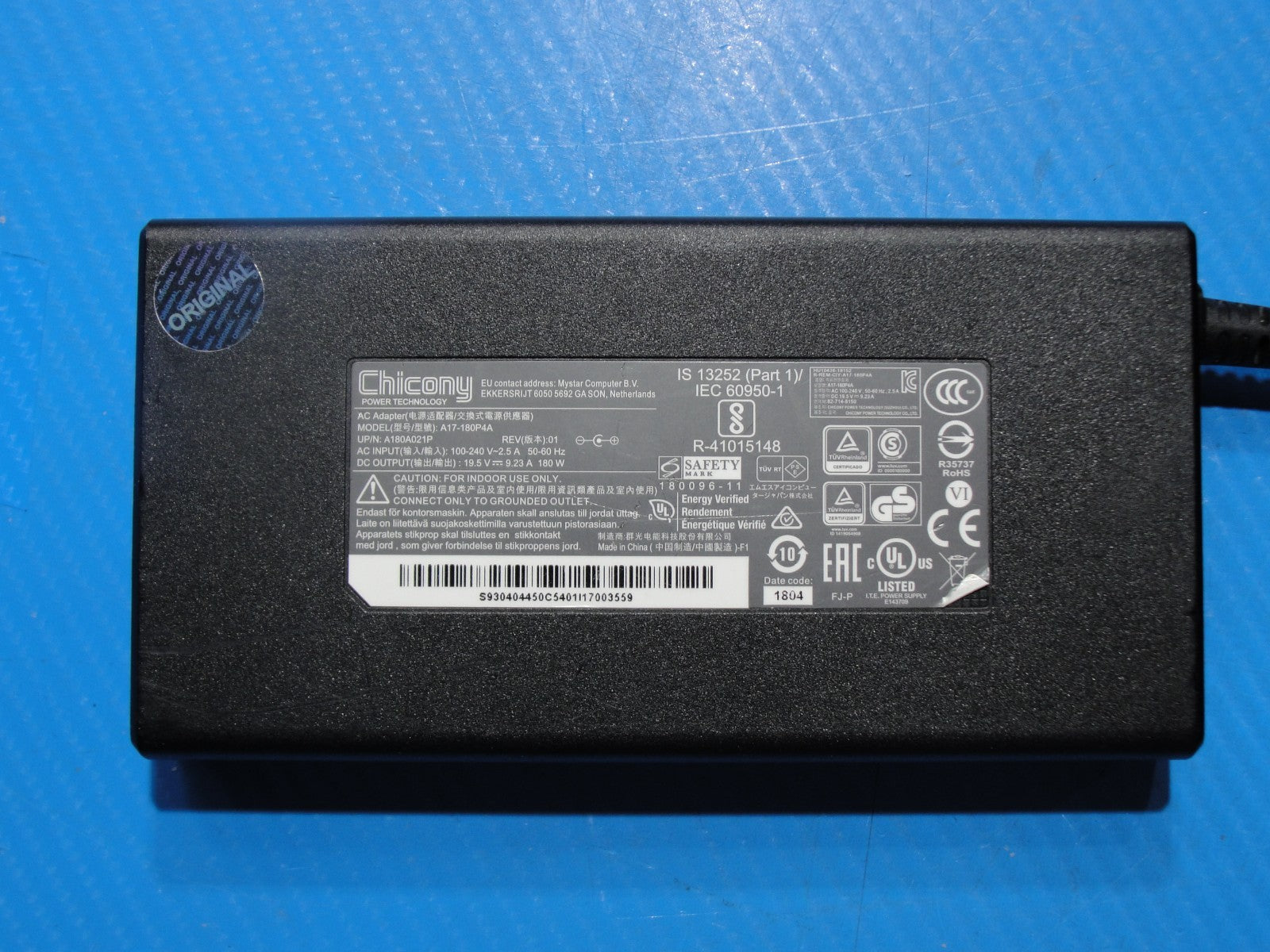 - Original Chicony 180W AC Adapter 19.5V-9.23A 5.5×3.0mm Barrel Plug No Pin Original Chicony 180W AC Adapter 19.5V-9.23A 5.5×3.0mm Barrel Plug No Pin