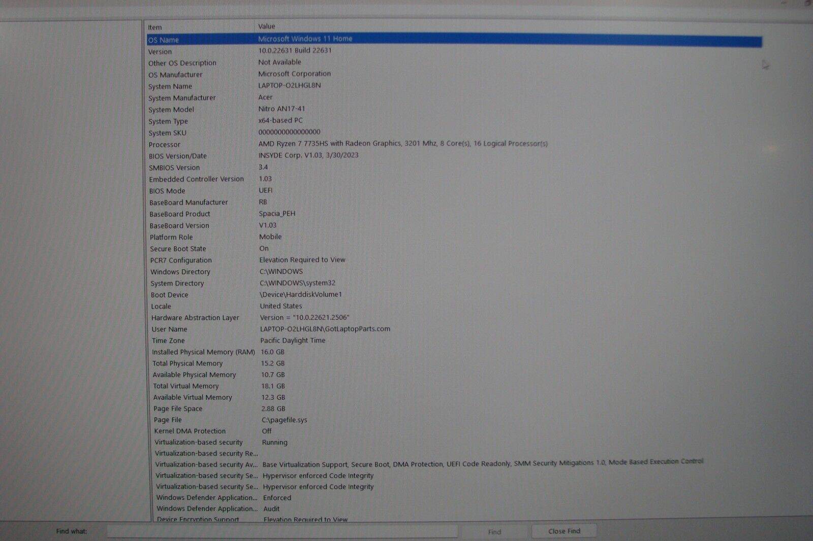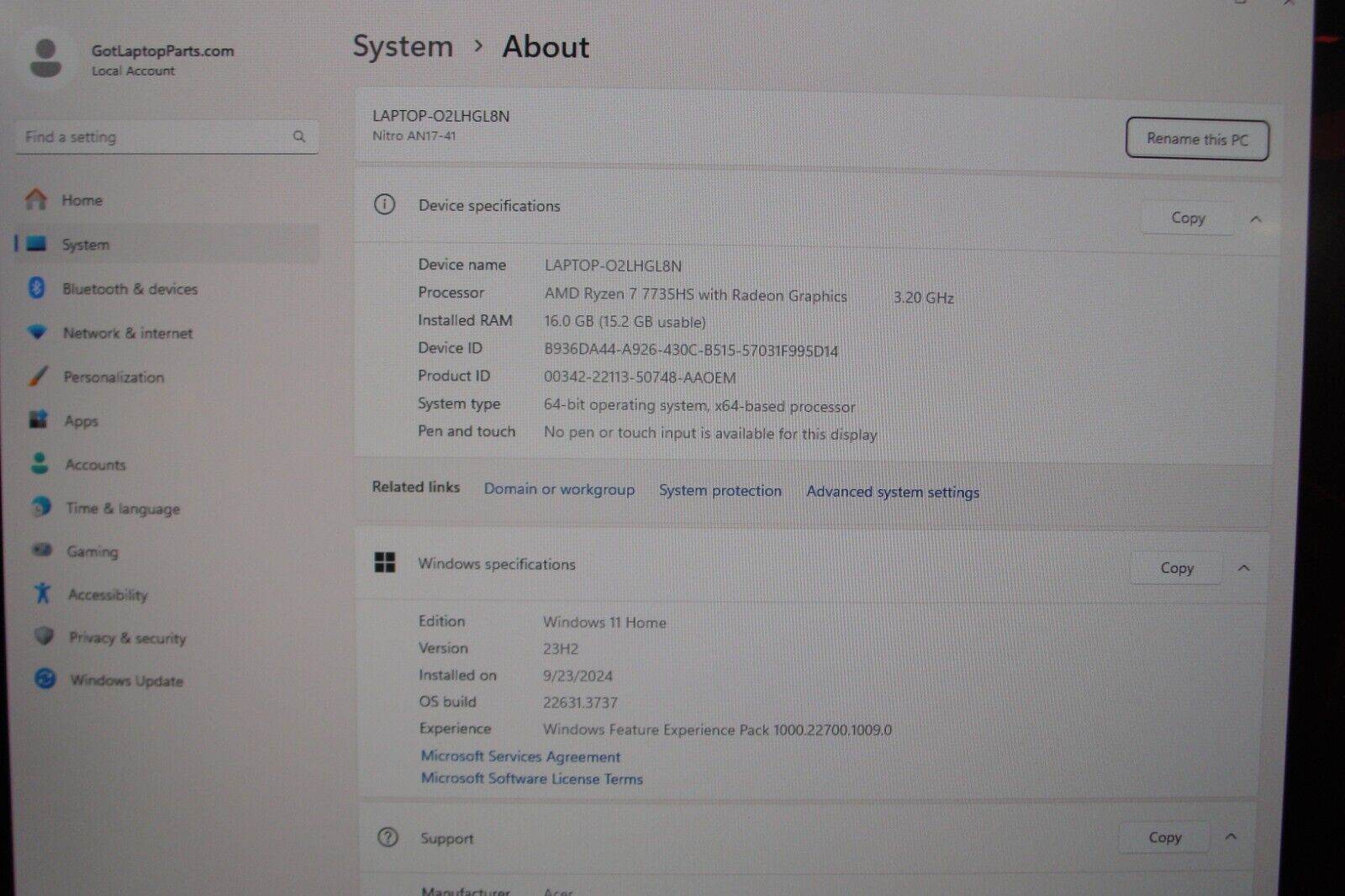 Acer Nitro AN17-41 AMD Ryzen 7 7735HS 3.20 GHZ 16 gb ram 165hz 17" FHD LCD is in Pristine condition with 1920x1080 NVIDIA GeForce RTX 4050 SSD: Reset 1TB and updated - Ready to use. 91% Battery in excellent condition according to battery report. (images included ) Cosmetic Condition: Grade A+ (images included ) Working Condition: Grade A+ Top and Bottom cover: This laptop shows minor signs of use. (image attached) Palmrest: like new (image included) Touchpad: like new (image included) Keyboard: like new (image included) Carefully tested by technicians and reset to factory Windows 11 Home. Includes power adapter. This Acer Nitro AN17-41 laptop boasts a powerful AMD Ryzen 7 processor with a speed of 3.20 GHz, making it perfect for a variety of uses such as workstation, casual computing, gaming, and graphic design. It features a 17-inch widescreen display with a maximum resolution of 1920 x 1080 and a 165hz monitor, providing a stunning visual experience. The laptop has 16GB of RAM and a 1TB SSD capacity, ensuring quick and efficient performance. In addition, this laptop comes with a NVIDIA GeForce RTX 4050 GPU. It runs on Windows 11 Home operating system and is cosmetically in Grade A+ working condition, despite showing slight signs of use. This laptop is a great choice for anyone seeking a high-performance machine for their computing needs. Actual item pictured. We don't hide defects or alter images to hide them. Serving for 15 years with immaculate performance.Beautiful Workstation Acer Nitro AN17-41 17" FHD 144hz AMD Ryzen 7 7735HS 3.2GHz 16GB RAM 1TB SSD NVIDIA GeForce RTX 4050 Powerful battery