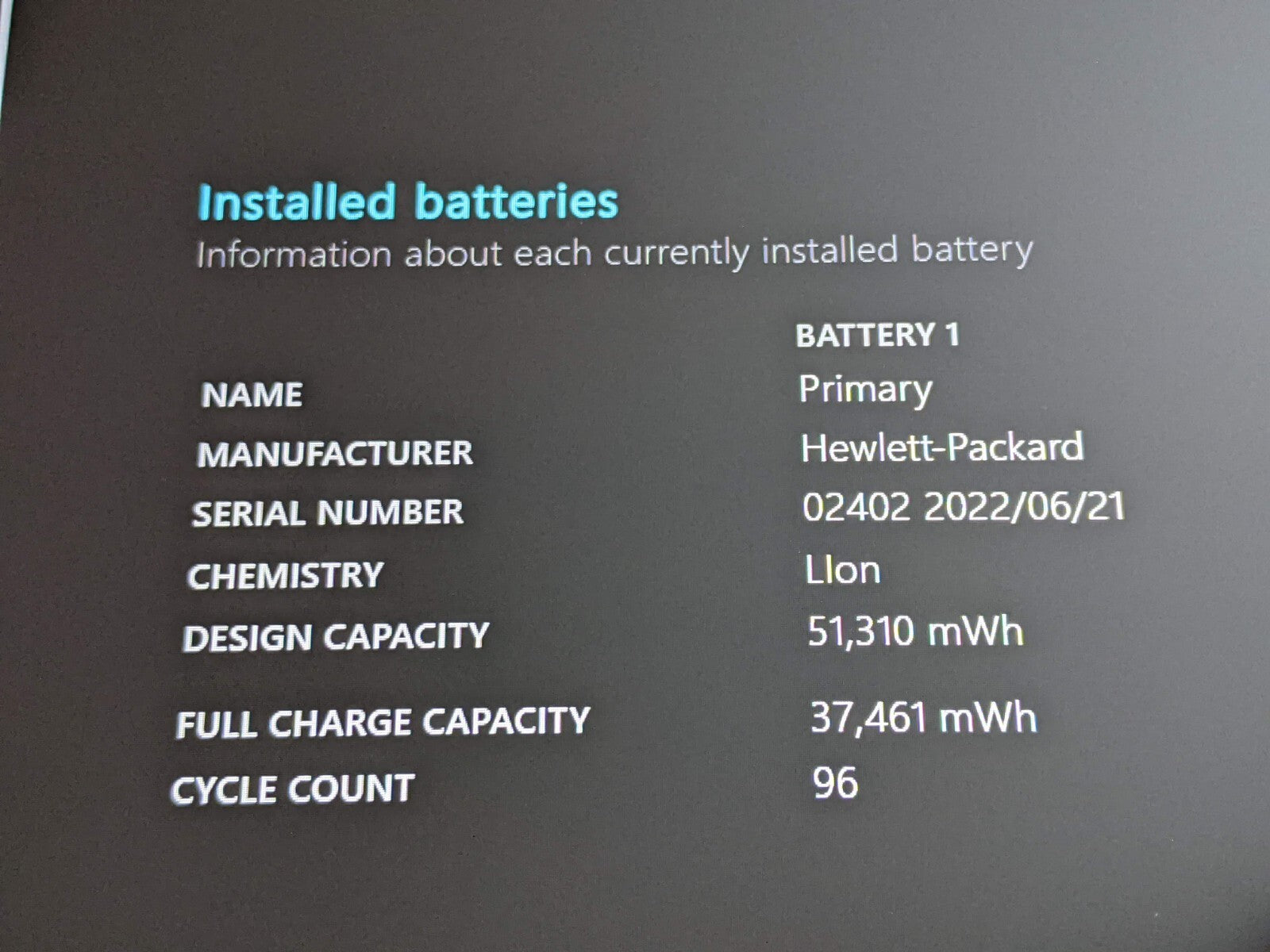 Battery: Used, 73%, 37 of 51 Wh