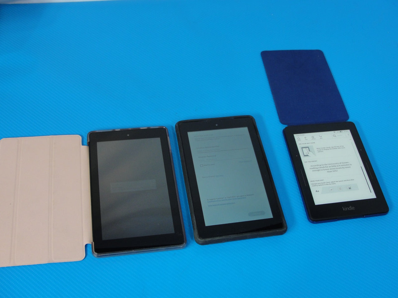 Sale is for lot of 3 amazon kindle tablets in good condition. 2x Amazon Kindle Fire 7 9th Gen M8S26G and 1x Amazon Kindle. All units come with case covers, as pictured. No other accessories are included. Actual item pictured.RETURNS POLICY (Excludes “As-Is” Items)